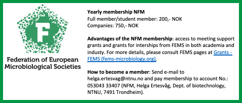 Registration: 1000,- for members and 1500,- for private non-members and 2000,- for industry. Payment should be done to account No.: 0530 43 33407 (NFM, Helga Ertesvåg, NTNU Dept. Biotechnology and Food Science). The fee covers coffee/tea, lunch and snacks.
